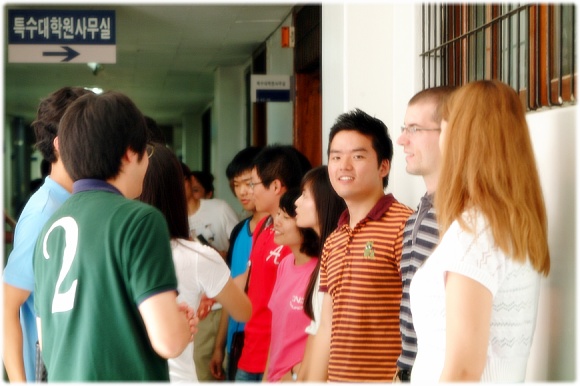 This man, Dr. Yong-hun Lee, is one of my favorite people. He is a lecturer in the Department of English Language and Literature at Hannam University. It was in 2006 that I first met him in class. My friends and I were surprised that he is a handicapped person with cerebral palsy. I couldn't accept how such a disabled person would teach students at a university. There was unconscious prejudice against the physically handicapped inside of me, which I never knew I had. After a short while, however, I greatly regretted my preconception. He was a well-prepared, brilliant and passionate instructor. Not only was his teaching method concise, but he tried to lead his students to the right path. He was a nice and humorous man who had a heart for students. He was a TEACHER. Thanks to him, my understandings about English linguistics have been broadened, and it inspired me to come to a graduate program. He encouraged me so that I can do it. Now, I am studying with him at a graduate school and I see him offering as many academic opportunities as possible to me and my classmates. It is a big joy to learn from him.